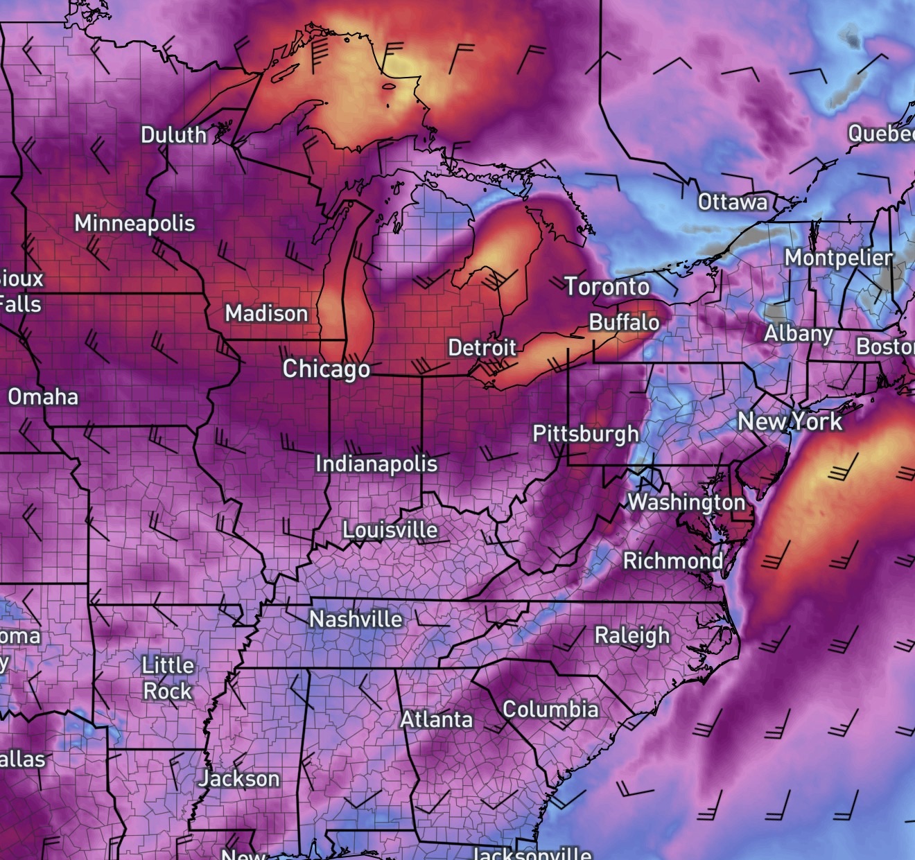 An intensifying low-pressure system, often called a “bomb cyclone,” is developing an will push a strong cold front through the Midwest and into the MidAtlantic late Sunday into Monday bringing intense wind and a significant temperature drop which could last into midweek.